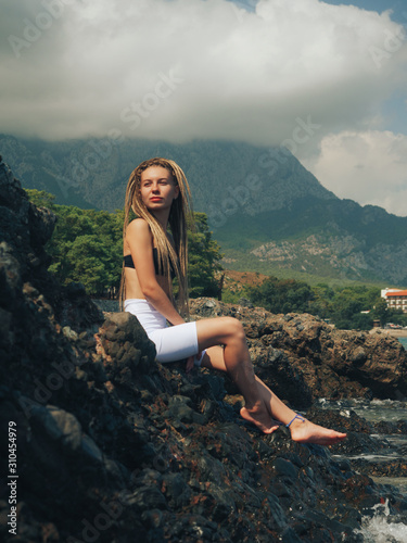 © Irina Magrelo, Obraz premium Young woman with dreadlocks sitting on the rocks