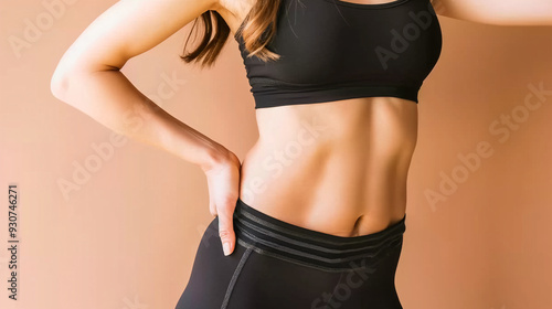 © chand, Fototapeta premium Young woman with flat belly on beige background