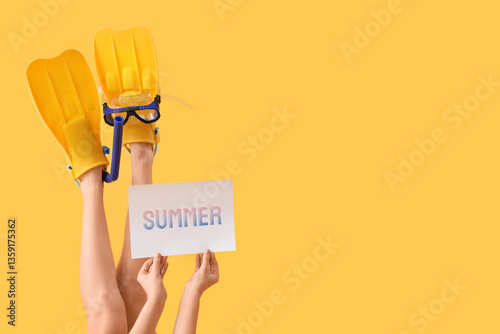Fototapeta premium Young woman with flippers, diving mask and word SUMMER on yellow background