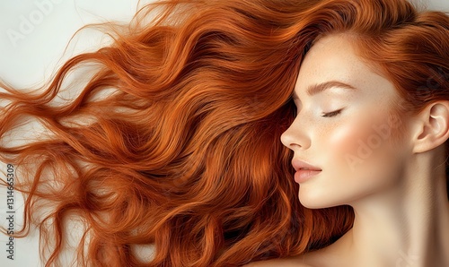 © Yuliia, Obraz premium Young woman with flowing red wavy hair against light background, eyes closed in serene expression, showing natural beauty and healthy glowing skin.