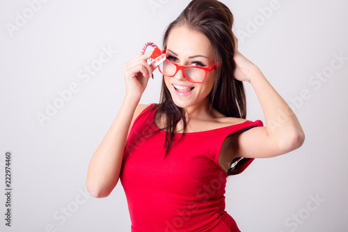 © Adriana Nikolova, Obraz premium Young woman with gift posing