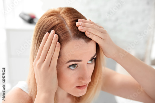 Naklejka premium Young woman with hair loss problem at home