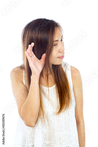 © suwatwongkham, Fototapeta premium young woman with hand behind ear listening
