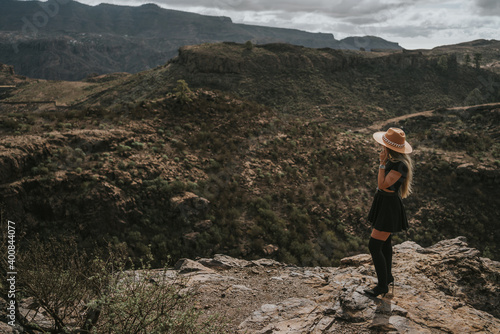 © Aridane, Obraz premium young woman with hat in the field looking at the camera