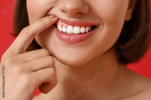 © Pixel-Shot, Obraz premium Young woman with healthy gums on color background, closeup