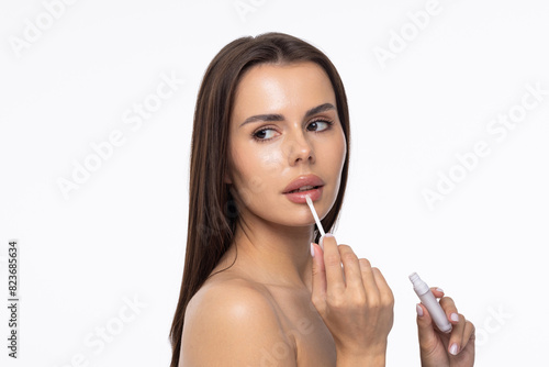 Fototapeta premium Young woman with healthy skin applying a protective lip balm n a white background