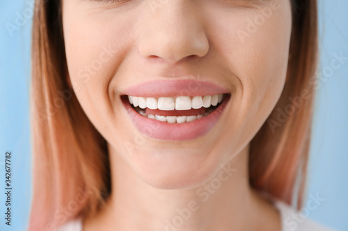 Obraz premium Young woman with healthy teeth on color background, closeup