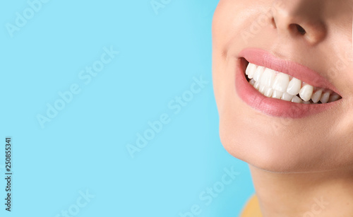 Obraz premium Young woman with healthy teeth on color background, closeup. Space for text