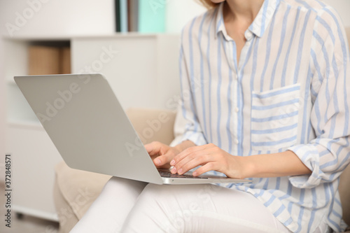 © New Africa, Naklejka premium Young woman with laptop sitting indoors, closeup