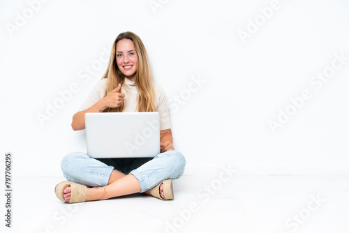 Naklejka premium Young woman with laptop sitting on the floor isolated on white background giving a thumbs up gesture