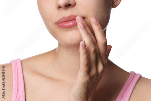 Fototapeta premium Young woman with lip balm on her lips against white background, closeup