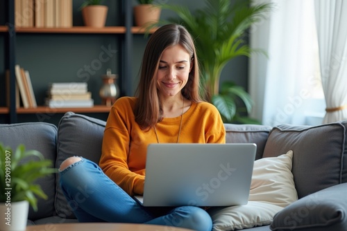Naklejka premium Young Woman with Long Brown Hair Sitting Cross-Legged on a Couch Working on a Laptop in a Bright Living Room with Indoor Plants and Comfortable Décor
