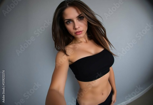 © Besler, Obraz premium Young woman with long brown hair taking a selfie
