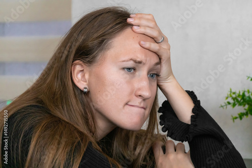 © yaroslav1986, Obraz premium Young woman with long brown hair wearing a black dress touching her forehead with her hand while suffering from a headache, expressing sadness, grief, stress, and frustration