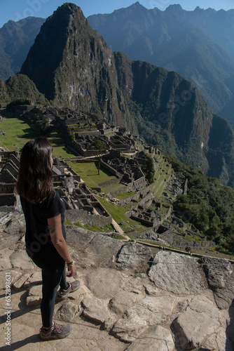 © Alberto, Obraz premium Young woman with long flowing hair, wearing sportswear, with her back turned looking at the archeological site of Machupicchu, Peru.
