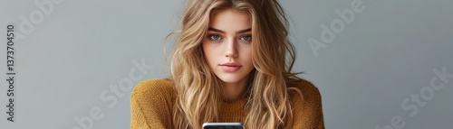 © I Have Photos, Obraz premium Young Woman with Long Hair Checking Phone in Warm Sweater Indoor