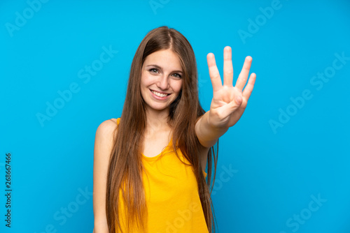 Fototapeta premium Young woman with long hair over isolated blue wall happy and counting four with fingers