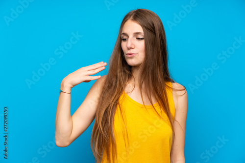 © luismolinero, Fototapeta premium Young woman with long hair over isolated blue wall with tired and sick expression