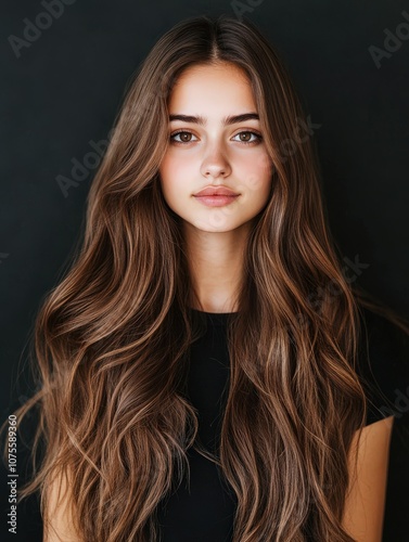 © BrandwayArt, Fototapeta premium Young woman with long hair poses against a dark background in studio