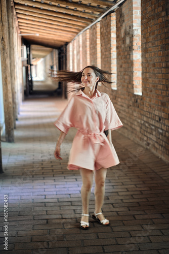 Naklejka premium Young woman with long hair twirls in pink dress, smiling in brick corridor....