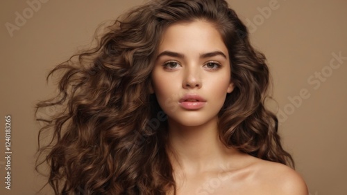 © piyawat, Fototapeta premium Young woman with long wavy hair in serious expression, styled in loose curls against neutral background. Soft lighting accentuates.