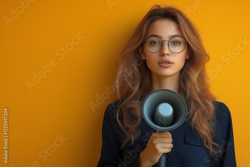 © Wilker, Fototapeta premium Young Woman with Megaphone Against Yellow Background
