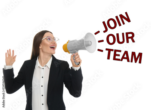 © New Africa, Naklejka premium Young woman with megaphone and phrase JOIN OUR TEAM on white background. Career promotion