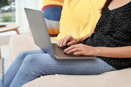© New Africa, Naklejka premium Young woman with modern laptop sitting on sofa at home, closeup