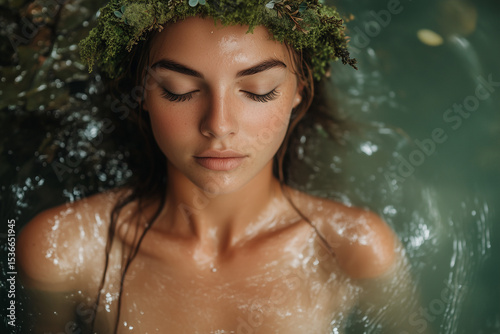 © Olena, Obraz premium Young Woman with Moss Crown Floats Calmly in Natural Water Setting