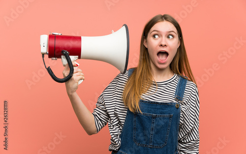 © luismolinero, Naklejka premium Young woman with overalls over pink wall taking a megaphone that makes a lot of noise