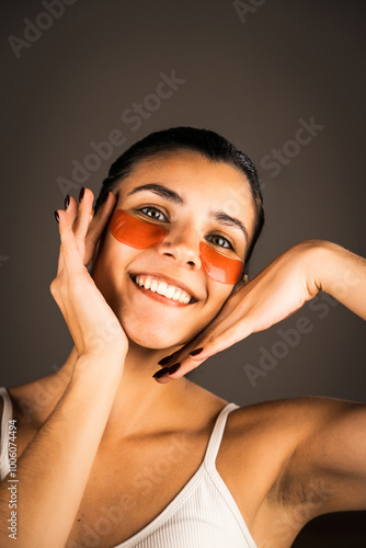 Fototapeta premium Young woman with perfect glowing skin and natural makeup posing for the camera with medical collagen patches under her eyes to reduce fatigue and puffiness. Skin care.Modern beauty tools concept