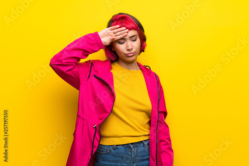© luismolinero, Fototapeta premium Young woman with pink hair over yellow wall with tired and sick expression