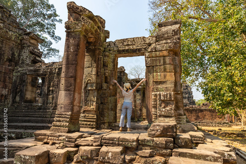 © umike_foto, Naklejka premium Young woman with raised hands stands near entrance of ancient temple in Angkor Wat.. South Asia travel banner template. Cambodia.