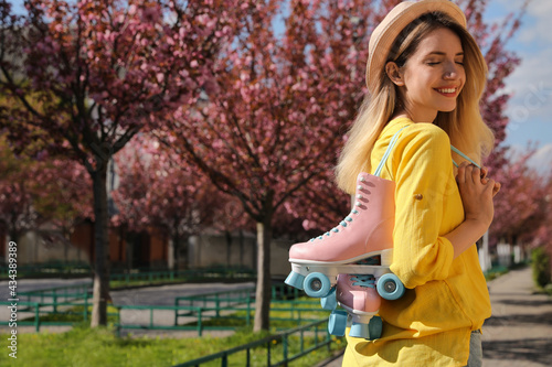 © New Africa, Naklejka premium Young woman with roller skates in spring park