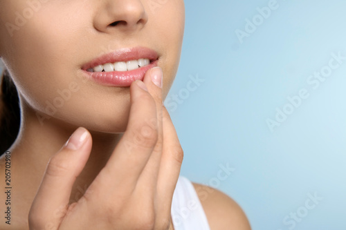 © New Africa, Obraz premium Young woman with sexy lips on color background, closeup