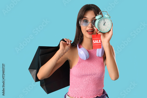 Obraz premium Young woman with shopping bags and alarm clock on blue background. Cyber Monday