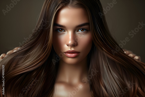 © Prasanth, Fototapeta premium young woman with straight long brown shiny hair. Beauty and hair care.keratin. Generative AI