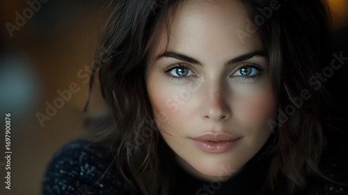 © Yuliia, Fototapeta premium Young woman with striking blue eyes and dark wavy hair gazing intensely at camera against blurred background, wearing black sweater. Natural makeup enhances facial features.