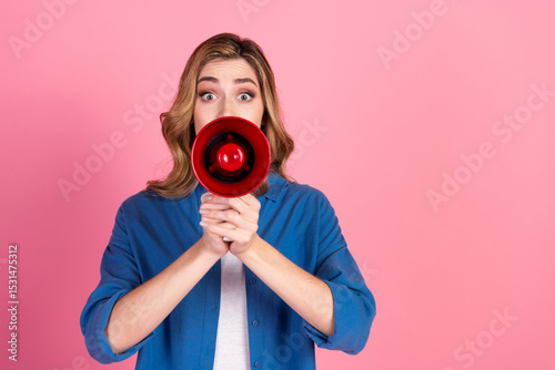 © deagreez, Obraz premium Young woman with surprised expression holding megaphone on bright pink background for communication, announcement, or advertising concept