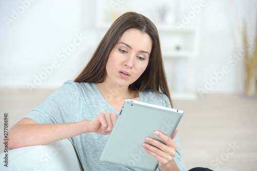 © auremar, Fototapeta premium young woman with tablet laying on sofa