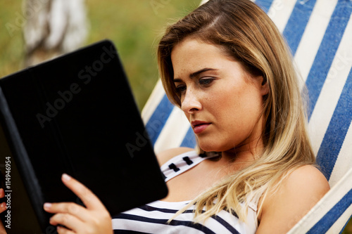 © Piotr Marcinski, Fototapeta premium Young woman with tablet on the hammock