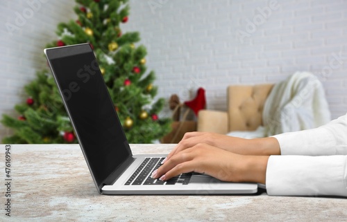 Naklejka premium Young woman work on laptop computer with blank display screen with living room interior design decorated for Christmas,