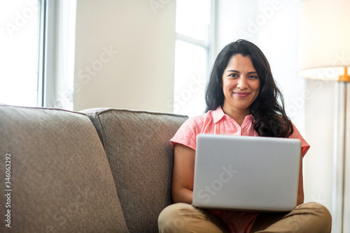 © digitalskillet1, Naklejka premium Young woman working at home sitting on a sofa.