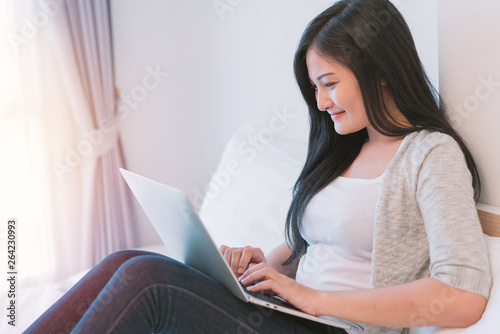 Fototapeta premium Young woman working on a laptop sitting on bed at home