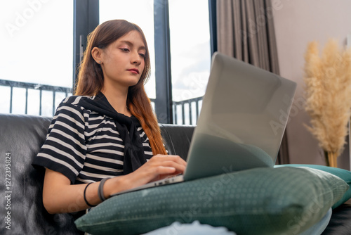© Jirakul, Naklejka premium young woman works on laptop while sitting on couch, focused and engaged. modern interior features large windows and decorative plants, creating cozy atmosphere