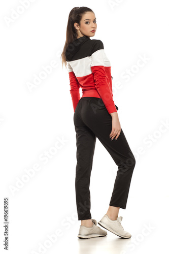 © vladimirfloyd, Fototapeta premium young women in black and red tracksuits on a white background