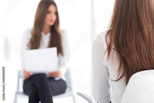 © freddy, Obraz premium Young women in therapy session discussing problems. Psychologist consulting patient