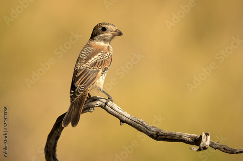 © Jesus, Naklejka premium Young Woodchat shrike chick in a Mediterranean forest with the first light of the day on a branch