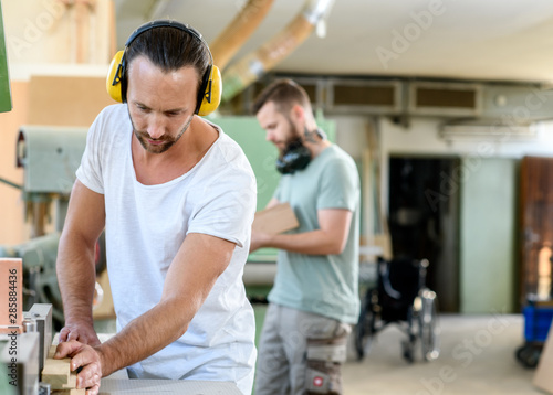 © Firma V, Obraz premium young worker in a carpenter's workshop using milling machine
