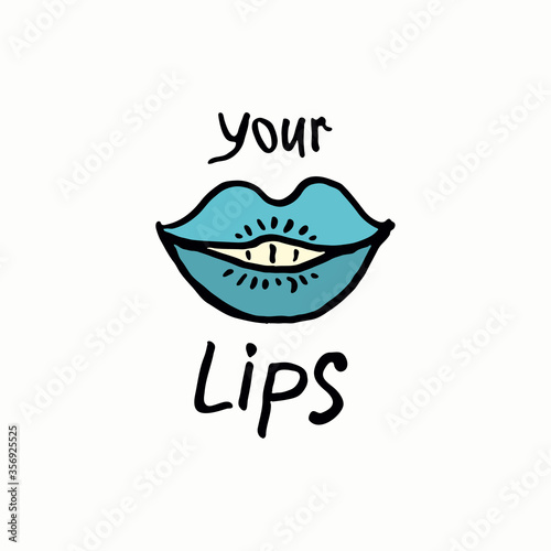 © difinbeker, Naklejka premium Your lips. Funny sketch illustration with blue-green lipstick girlish lips and the inscription. Joke vector template print on postcard, t-shirt, card, cup or other.